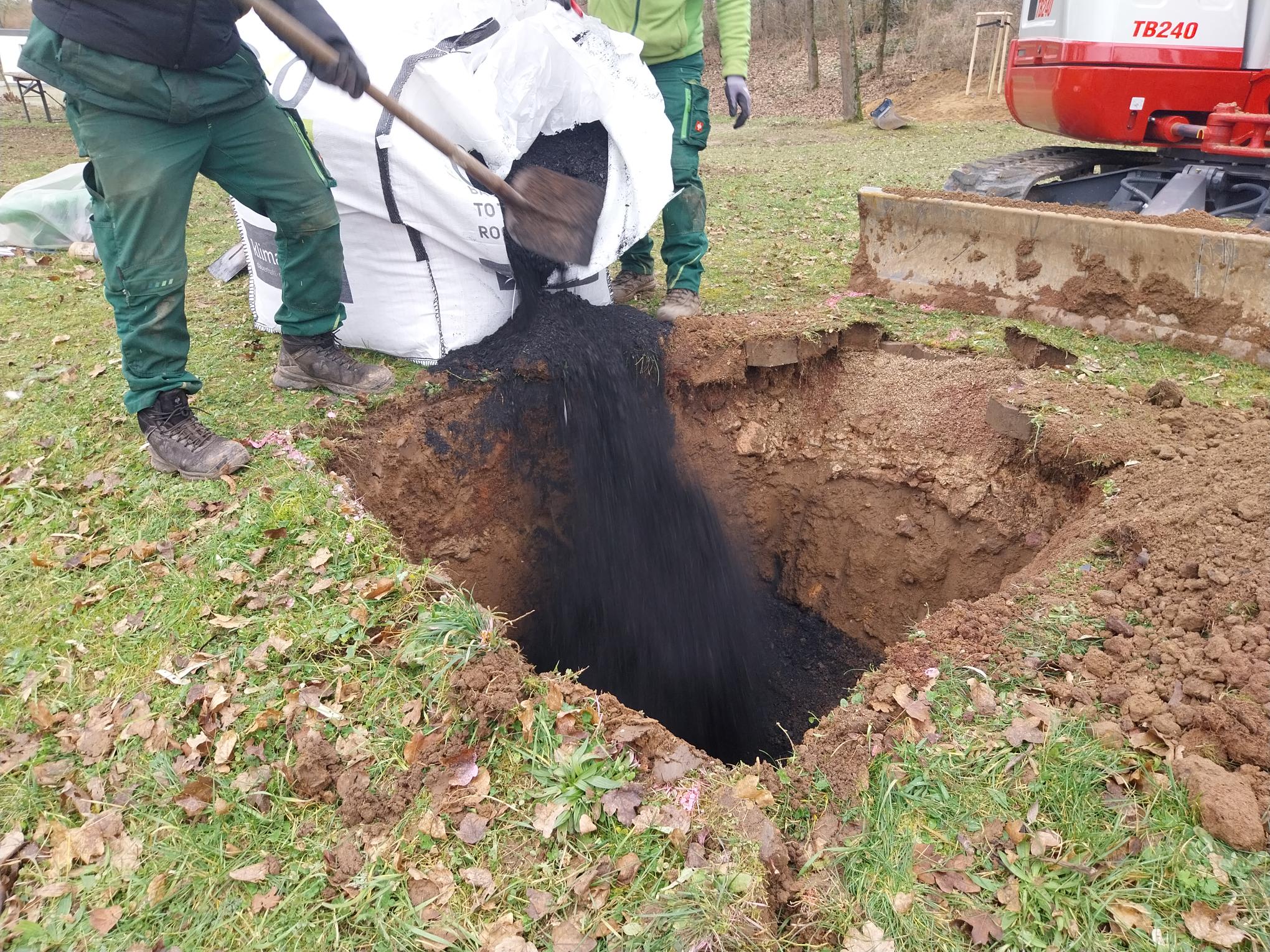 Einsetzen des Baumes in die mit Pflanzenkohle vorbereitete Baumgrube